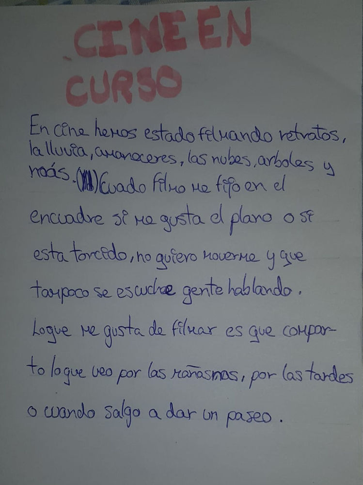 En cine hemos estado filmando retratos, la lluvia, amaneceres, las nubes, árboles y más. Cuando filmo me fijo en el encuadre, si me gusta el plano o si está torcido, no quiero moverme y que tampoco se escuche gente hablando.