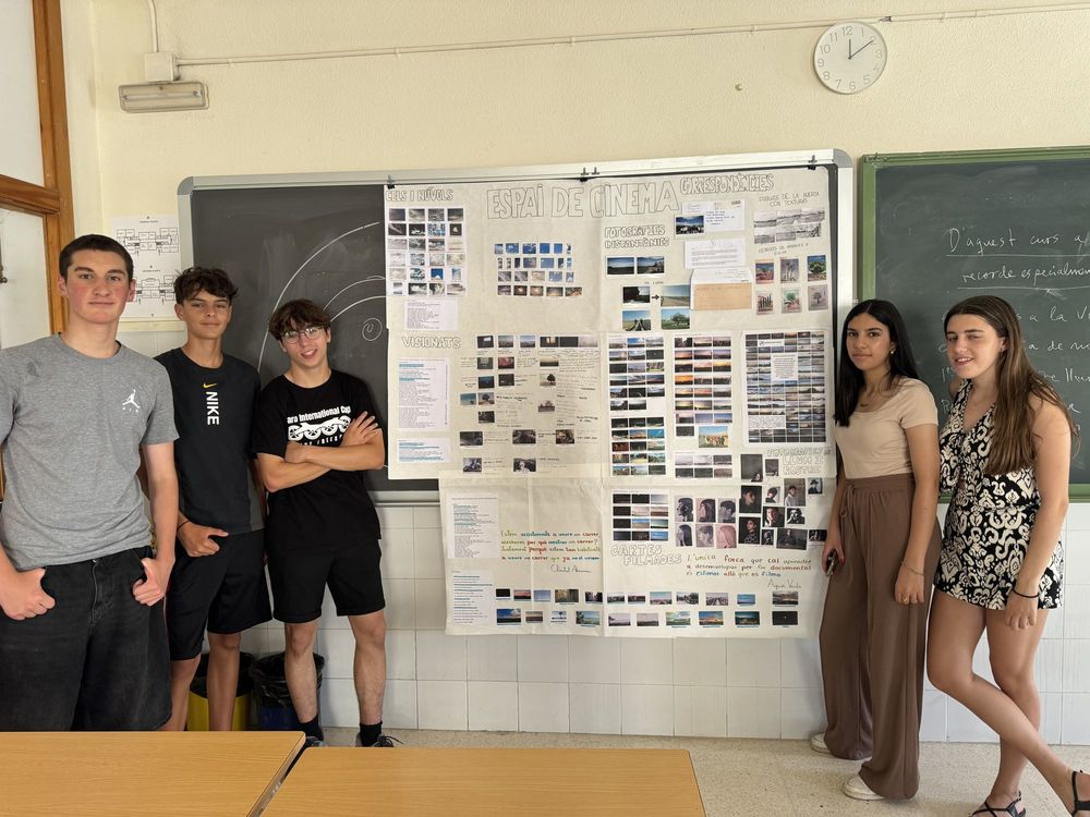 El nostre espai de cinema està organitzat en diferents parts, ordenades cronològicament, tot començant per la proposta de cels i núvols, on hem fet un collage de les nostres fotografies. Després, trobem la part on hem penjat el díptic fet amb la càmera instantània, així com la secció de correspondències, on hem anat penjant les cartes que ens hem intercanviat amb l'Institut Carles Capdevila, d'Hostalets de Balenyà. Quan vam començar a fer visionats de fragments de pel·lícules vam començar a fer la part de visionats i a anar plenant l’ espai amb captures dels fragments. Al costat vam apuntar les paraules clau que identifiquen cada fragment, i que prèviament havíem escrit a les nostres llibretes.