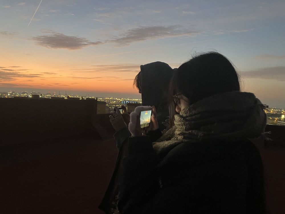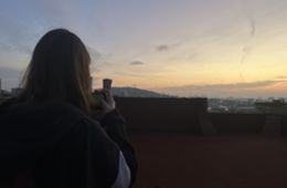 17 pisos. Es veuen moltes coses. Moltes. Tots els edificis il·luminats per les llums càlides del matí. El cel ataronjat. El Jaime ha portat una Instax. Tot el món fa silenci. Almenys per nosaltres. Un silenci i una calma que es trenquen pel so del tren. Una sensació que no saps què és ni com descriure. Potser això és el que ens agrada d’aquesta sensació, no pots descriure-la, però tothom l’entén.