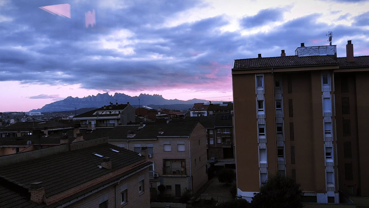 En aquest pla el que més destaca són els colors blavosos i els reflexos roses dels núvols que davant tenen la muntanya de Montserrat.