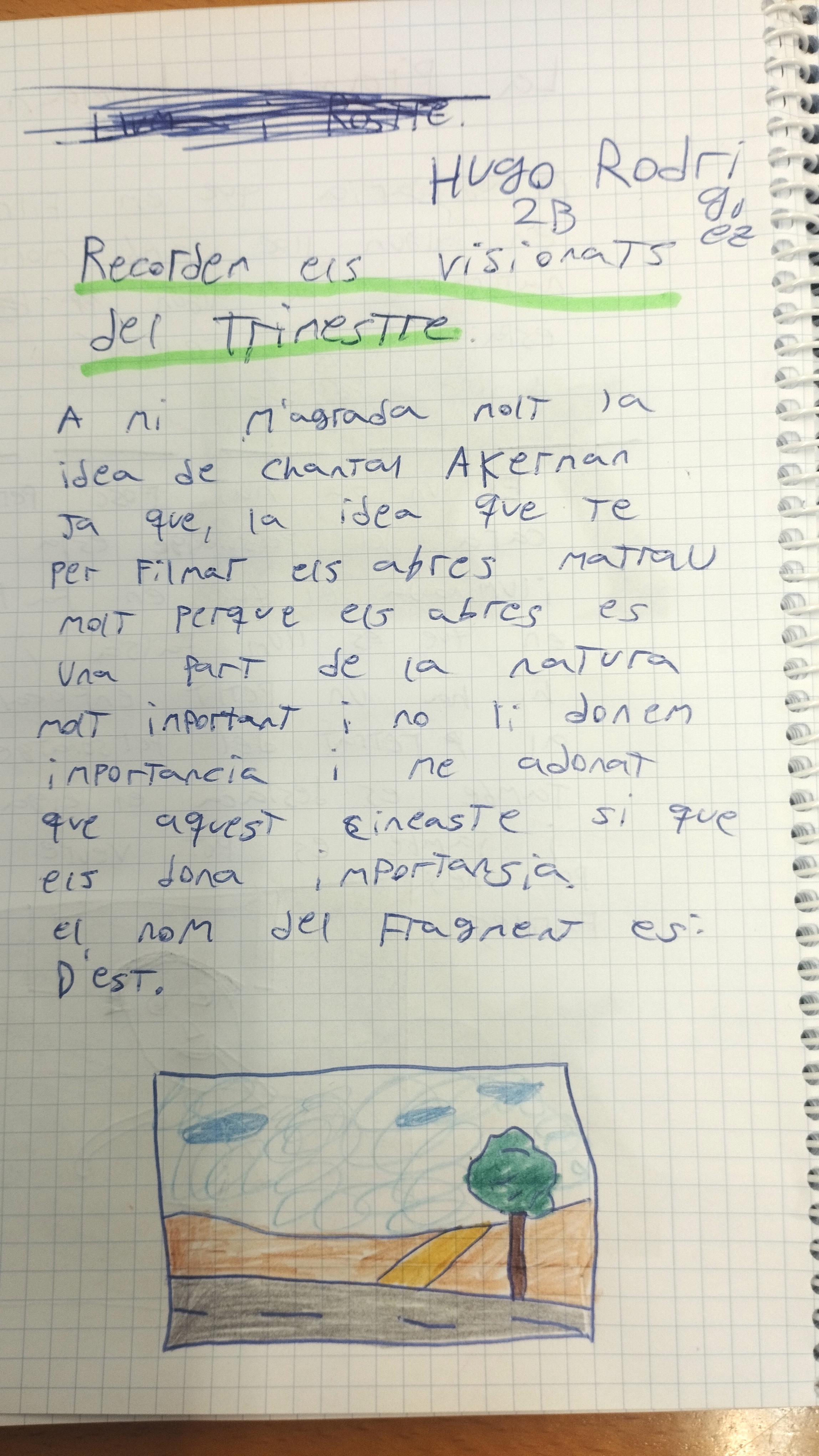 Estem acabant el primer trimestre i ens hem plantejat quin és el visionat que més ens ha inspirat o que recordem especialment de tots el que hem vist. Cadascú l’ha descrit a la seva llibreta i n’ha fet un petit dibuix.
