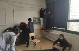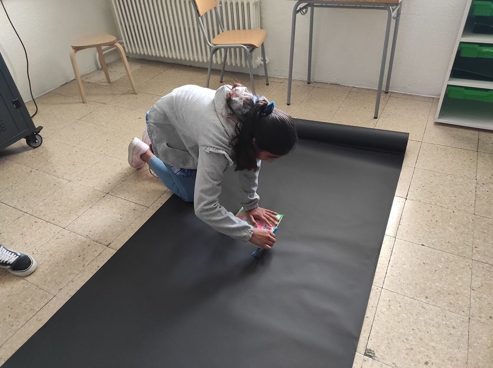 Vam necessitar molt paper d’embalar per poder tapar la llum que entrava per les finestres. Després, amb la petita finestreta que vam retallar per on podia entrar la llum, vam anar fent diverses proves fins que vam aconseguir que es projectés la imatge.