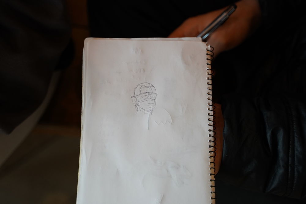 Juan nos mostró su modesto taller de pintura repleto de estantes con botes de pintura, sus utensilios y herramientas de trabajo. Su trabajo consiste en conseguir el color exacto según demanda la exposición. Ellos no pintaban la pared de la exposición completa, sino que se encargan de realizar las distintas pruebas de color hasta dar con la tonalidad exacta. Uno de sus trabajos puntuales era imitar las texturas del suelo a modo de pátina para conseguir disimular el defecto hasta que fuera reparado con la pieza necesaria.
