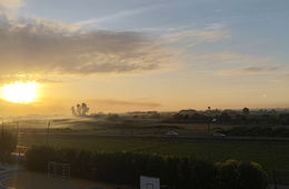 Em sembla molt original aquest pla, ja que en l’enquadrament podem observar un tros de ciutat i unes difuminades muntanyes al fons junt amb la sortida del sol. També m’agrada molt el cel i aquests núvols tan bonics. Crec que hi dona un toc molt interessant, la barreja de color amb el negre dels edificis i el groc del cel.