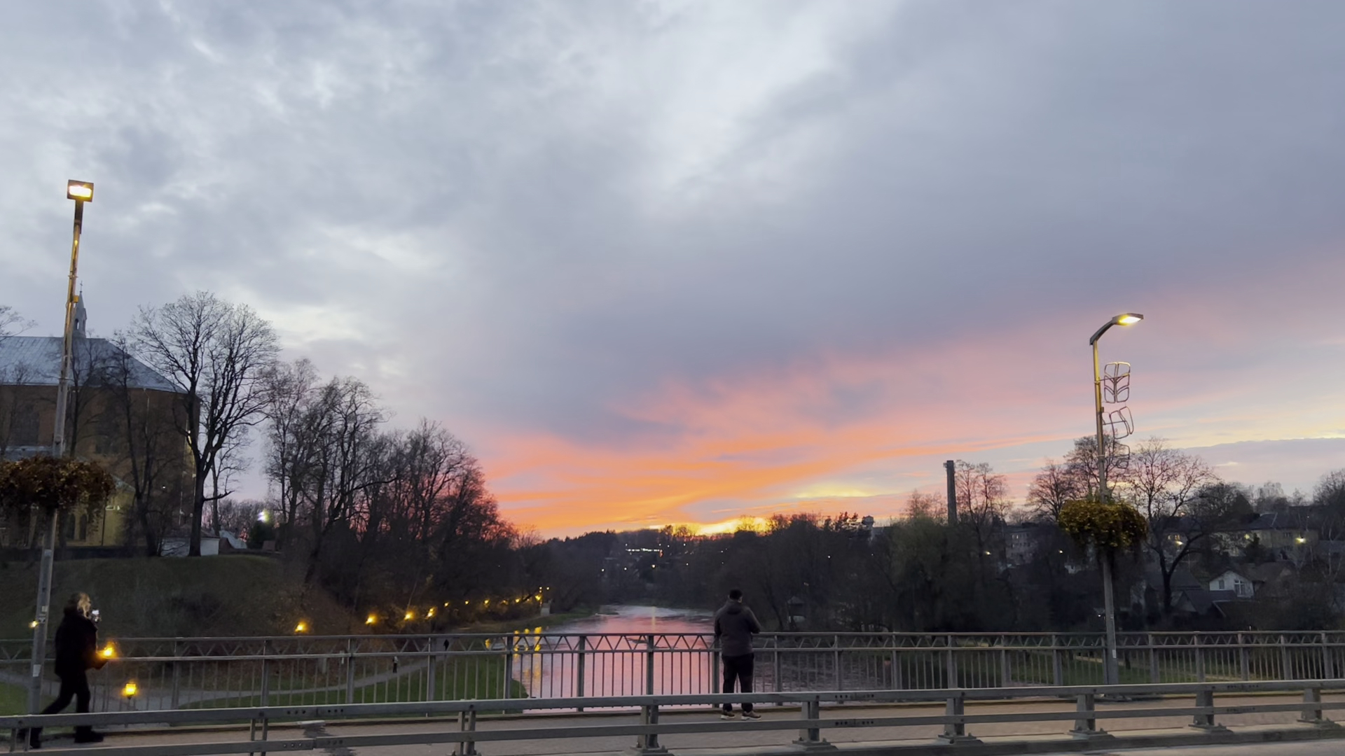 Hem escollit un pla de Lituània filmat a les 16h45, pels colors del cel, diríem que és l’hora màgica. En aquest pla hem vist moltes coses per exemple els cotxes, el cel, un home, un riu i cases. El que més ens ha cridat l'atenció ha sigut el cel i ens hem quedat impressionats amb la seva bellesa. Volem destacar el reflex del sol i el riu que hi ha. A la persona que ha filmat aquest pla li diríem que ha fet molt bon pla del món i voldríem saber en quin lloc específicament l’ha fet.