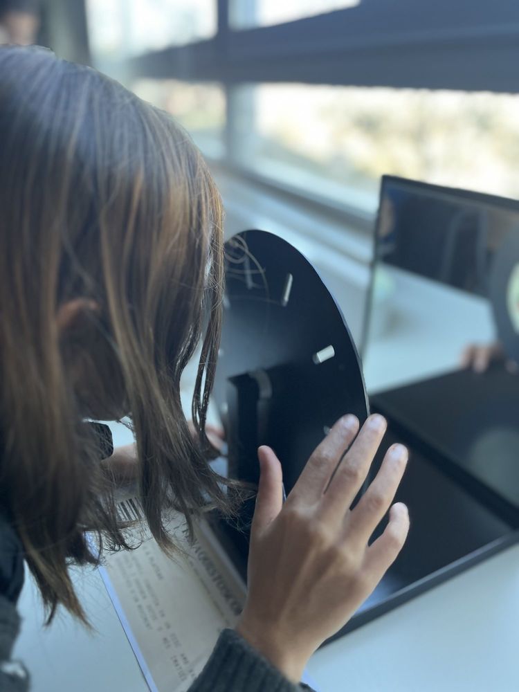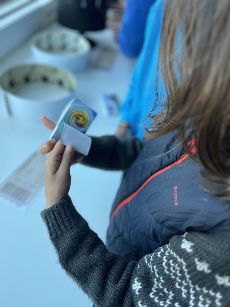 Els infants observen, giren, s’inclinen. Apropen els ulls al zoòtrop, fan rodar les imatges i descobreixen, gairebé amb sorpresa, que el dibuix es mou. Les mans subjecten els aparells amb cura; el cos acompanya el gest de mirar. El temps s’alenteix mentre intenten entendre què passa entre una imatge i la següent.