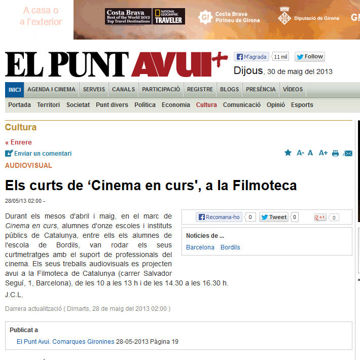 Projecció dels films realitzats pels 11 centres participants al programa anual de Cinema en curs 2012-2013: Davant la separació (Escola de Bordils), Quan una porta es tanca (Escola Montserrat Solà), Tornar a començar (Escola Els Xiprers), Germanes (Escola Rafael Alberti), Decisions (Institut Bellvitge), Incerteses (Institut Castellet), On vaig? (Institut Joan d’Àustria), Llums a la nit (Institut Júlia Minguell), Deixa'm ser qui sóc (Institut La Plana), Primers dies (Institut Milà i Fontanals), El sol sempre torna (Institut Narcís Monturiol).