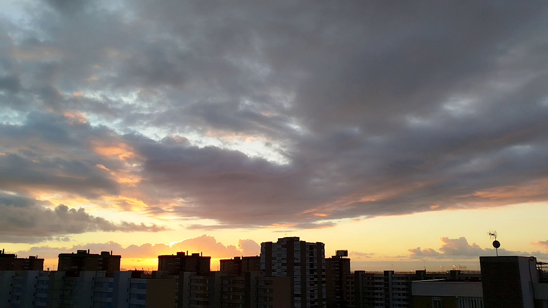 A aquest pla podem contemplar la sortida del sol espectacular, amb uns tons ataronjats, grocs il·luminats i els núvols grisos li donen un toc contrastant al cel molt clar entre un blanc i un blau molt fluixet. També la tria del lloc on s’ha filmat és l’adequada, ja que podem veure part del cel i una petita part dels edificis que contrasten molt bé.