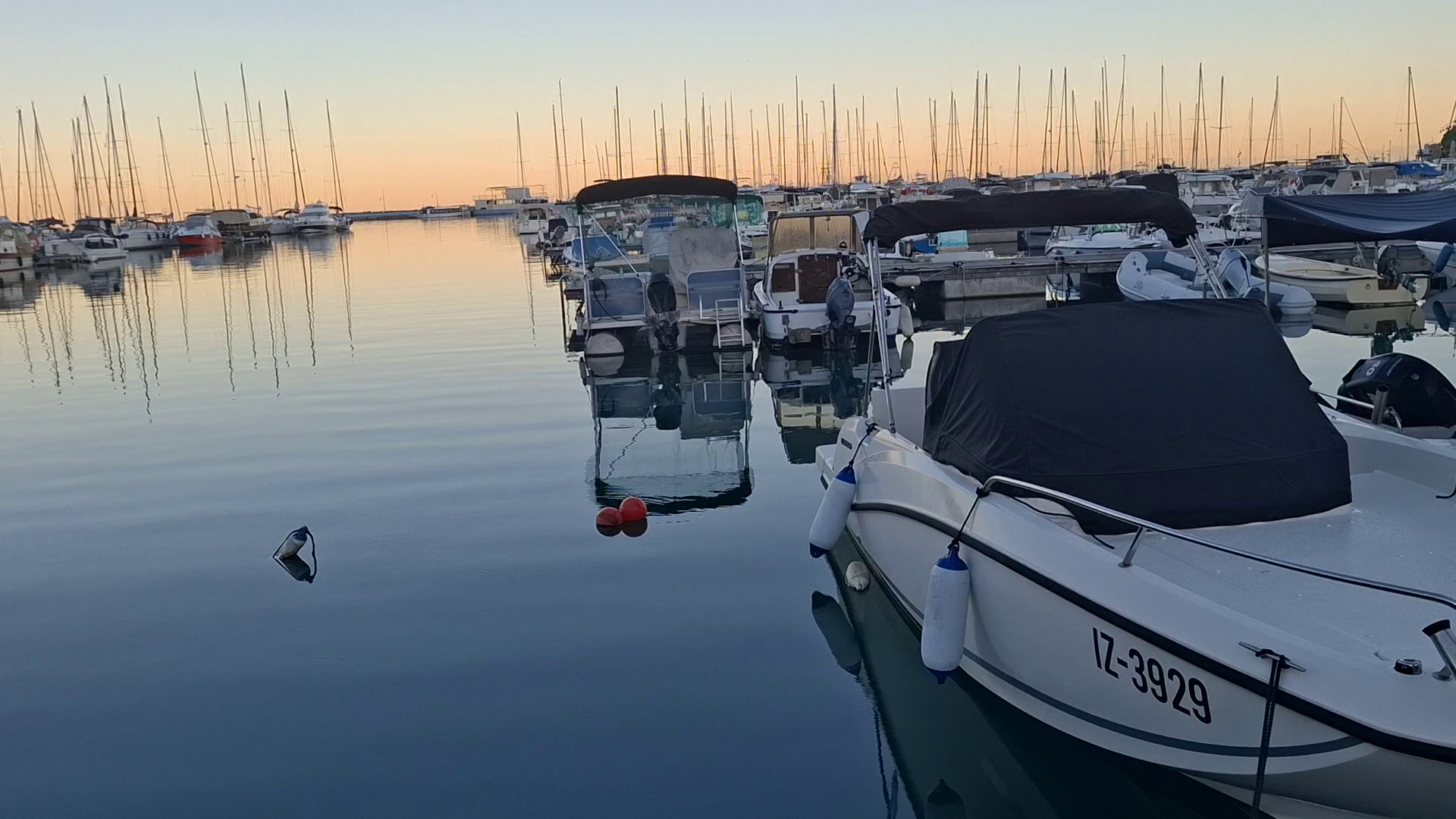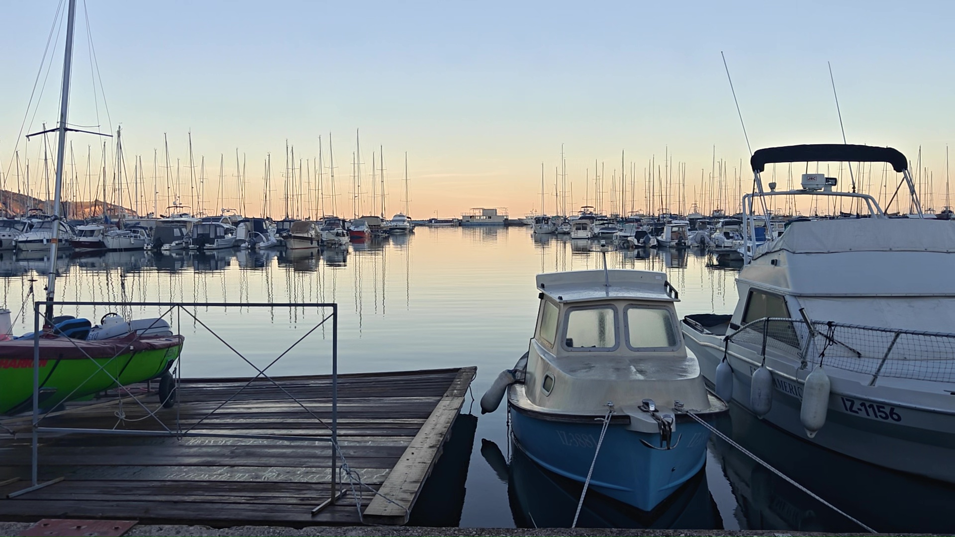 Ens situem en un port on hi ha barques. El cel té un color groc que ens fa suposar que és a la sortida o a la posta de sol. El mar ocupa la major part del pla. Crec que en aquest pla destacaria l’aigua: em sembla preciós la forma en la qual es reflecteix el color del cel i, al estar molt plana, es veu molt millor. També destacaria els vaixells, que creen un molt bon contrast amb tot el pla. Finalment, vull destacar la boia que hi ha a la part esquerra del pla, crec que en ser una cosa tan petita enmig d'un gran tros d’aigua és el primer en el qual t’hi fixes en veure el pla.