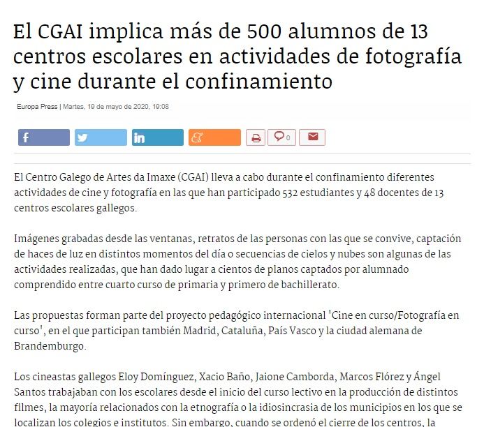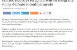 "Las propuestas forman parte del proyecto pedagógico internacional 'Cine en curso/Fotografía en curso', en el que participan también Madrid, Cataluña, País Vasco y la ciudad alemana de Brandemburgo. Los cineastas gallegos Eloy Domínguez, Xacio Baño, Jaione Camborda, Marcos Flórez y Ángel Santos trabajaban con los escolares desde el inicio del curso lectivo en la producción de distintos filmes, la mayoría relacionados con la etnografía o la idiosincrasia de los municipios en los que se localizan los colegios e institutos. Sin embargo, cuando se ordenó el cierre de los centros, la actividad se adaptó a la nueva situación."
