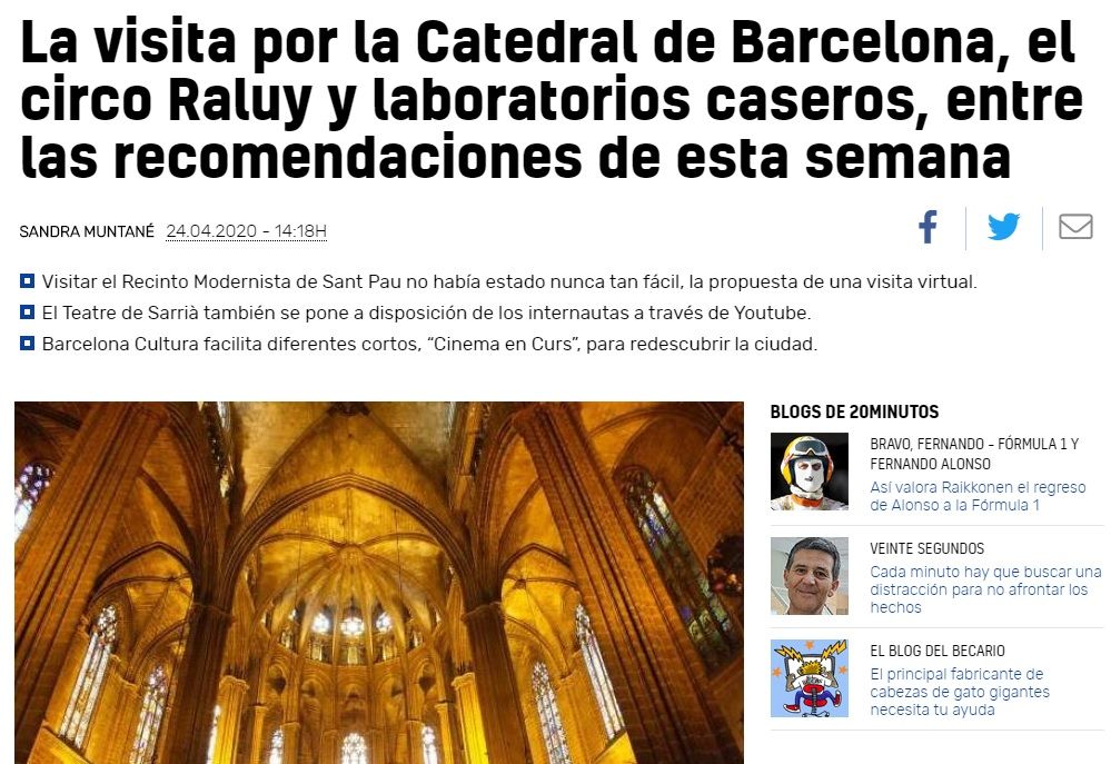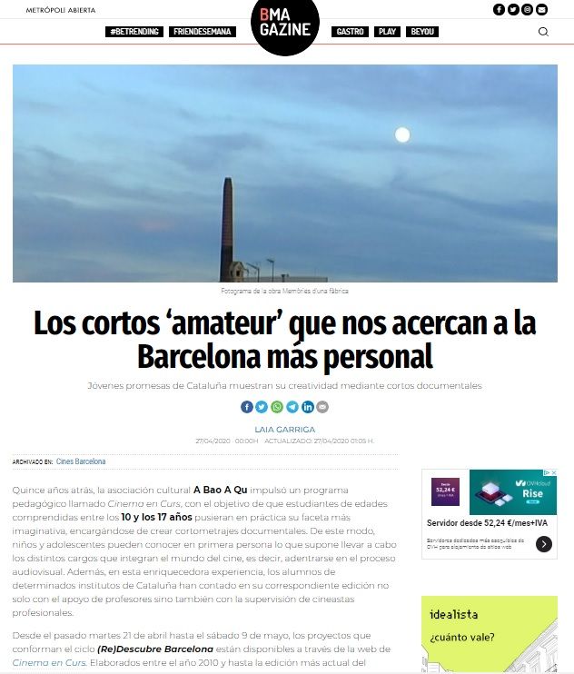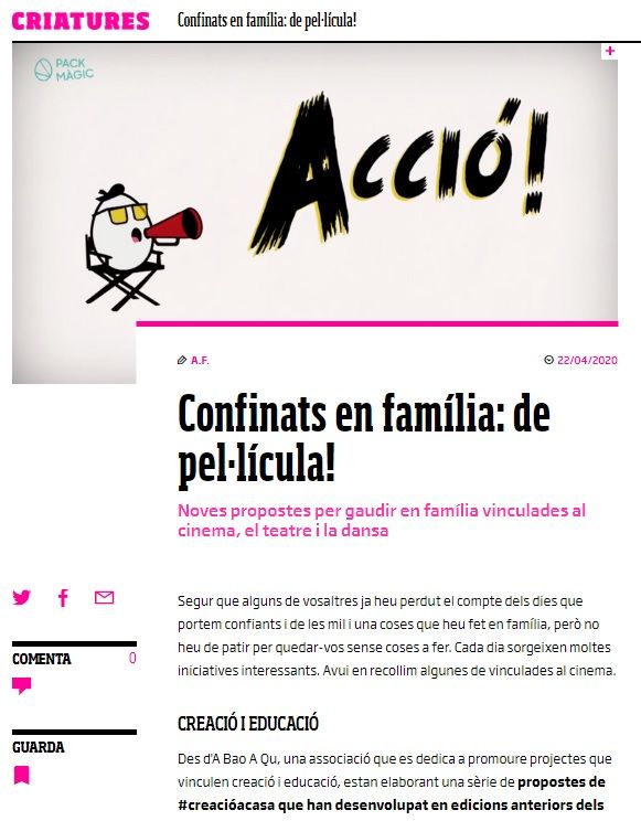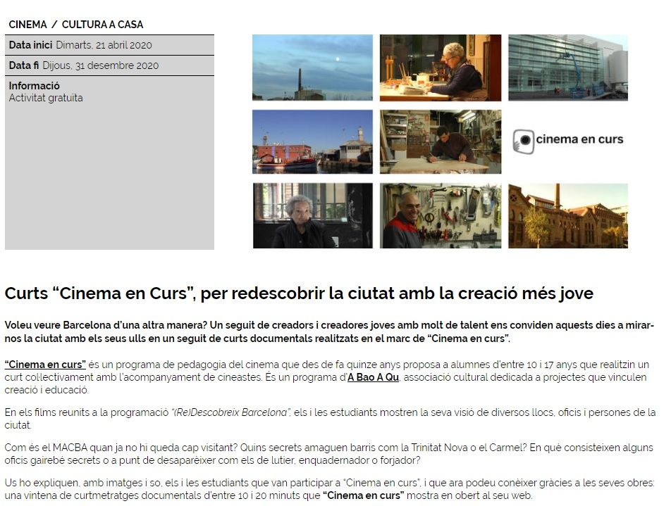 El medio recomienda las propuestas que presenta Barcelona Cultura para afrontar el confinamiento. Entre ellas, destacan los cortos de Cinema en curs (Re)Descobreix Barcelona: "Es un programa de pedagogía del cine que desde hace quince años propone a #alumno de entre 10 y 17 años que realicen un corto colectivamente con el acompañamiento de cineastas. Es un programa de A Bao A Qu, asociación cultural dedicada a proyectos que vinculan creación y educación".