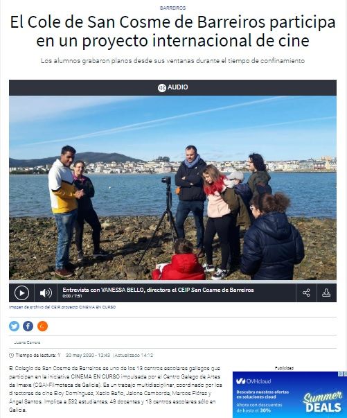 "El Colegio de San Cosme de Barreiros es uno de los 13 centros escolares gallegos que participan en la iniciativa CINEMA EN CURSO impulsada por el Centro Galego de Artes da Imaxe (CGAI-Filmoteca de Galicia). Es un trabajo multidisciplinar, coordinado por los directores de cine Eloy Domínguez, Xacio Baño, Jaione Camborda, Marcos Flórez y Ángel Santos. Implica a 532 estudiantes, 48 docentes y 13 centros escolares sólo en Galicia."