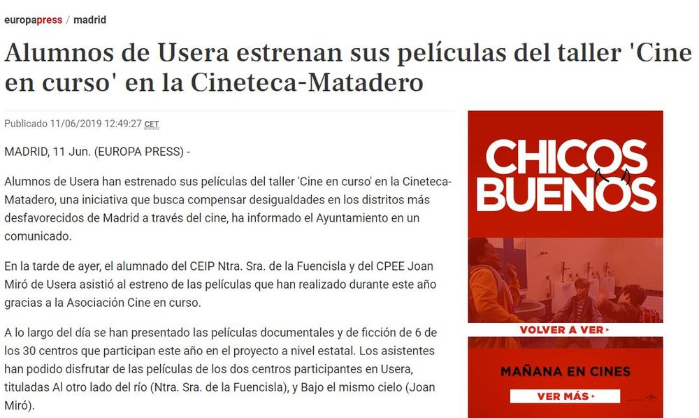 El día 10 de junio, los participantes de seis talleres de ficción y documental de Cine en curso Madrid, Catalunya y Galicia estrenan sus películas en Cineteca Madrid. Se presentan los siguientes films: