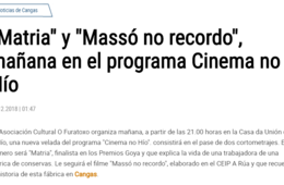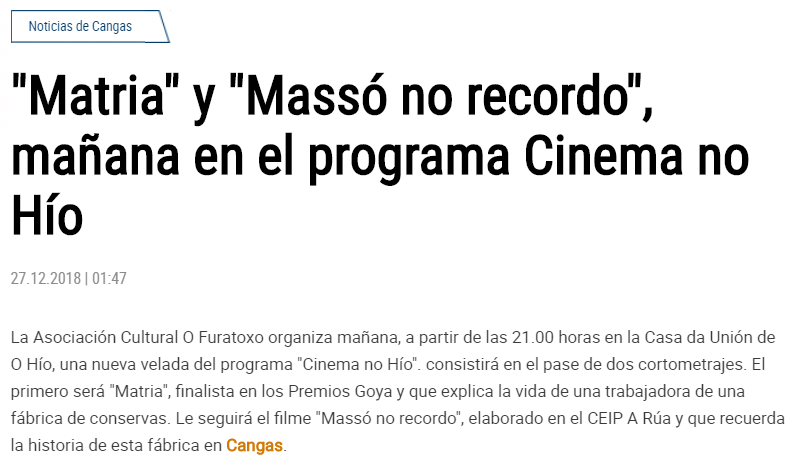El film Massó no recordo, realitzat pels alumnes del CEIP A Rúa a Cinema en curso Galicia 2013-2014, es projecta dins el cicle Cinema no Hío, organitzat per l’associació cultural O Furatoxo, juntament amb el curtmetratge Matria d’Álvaro Gago. Una delegació d’alumnes i professors del CEIP A Rúa assisteixen a la projecció i presenten la pel•lícula. L’acte té lloc a la Casa da Unión a les 21h.