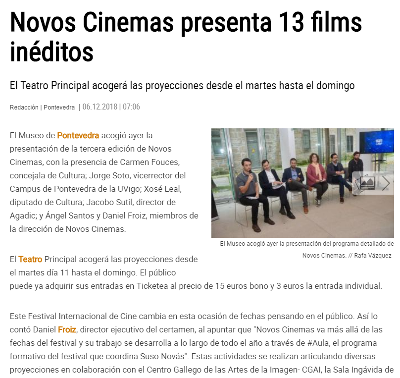 La notícia de presentació del festival Novos Cinemas menciona que el treball del festival va més enllà de les dates estrictes del certamen i s’articula al voltant de projectes internacionals com Cinema en curs i Cined.