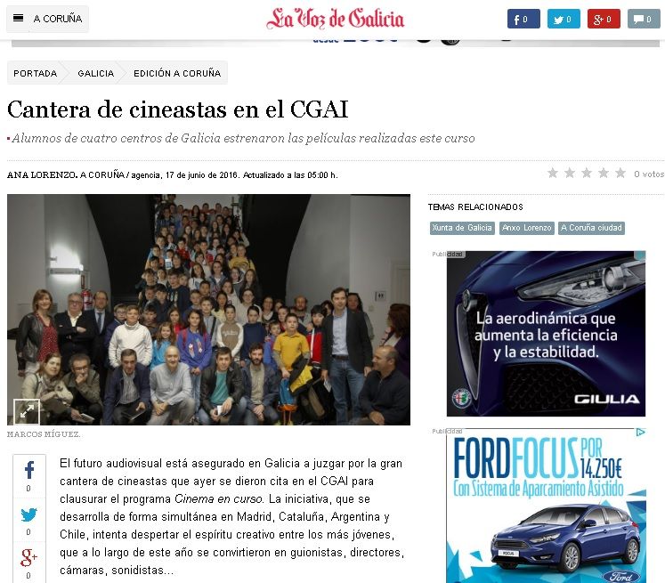 Estreno en el CGAI (Centro Galego de Artes da Imaxe) de las cuatro películas realizadas en Cine en curso Galicia: Paso a paso (CEIP A Rúa), O acordar (CEIP San Xoán), Sons no camiño (IES Manuel Chamoso Lamas), Voces dunha paisaxe (IES Manuel Murguía).