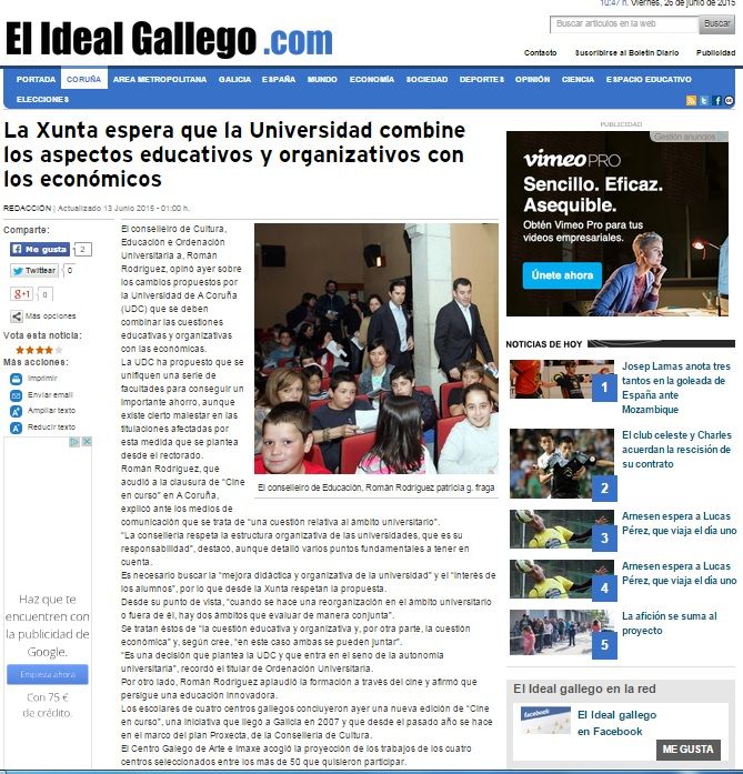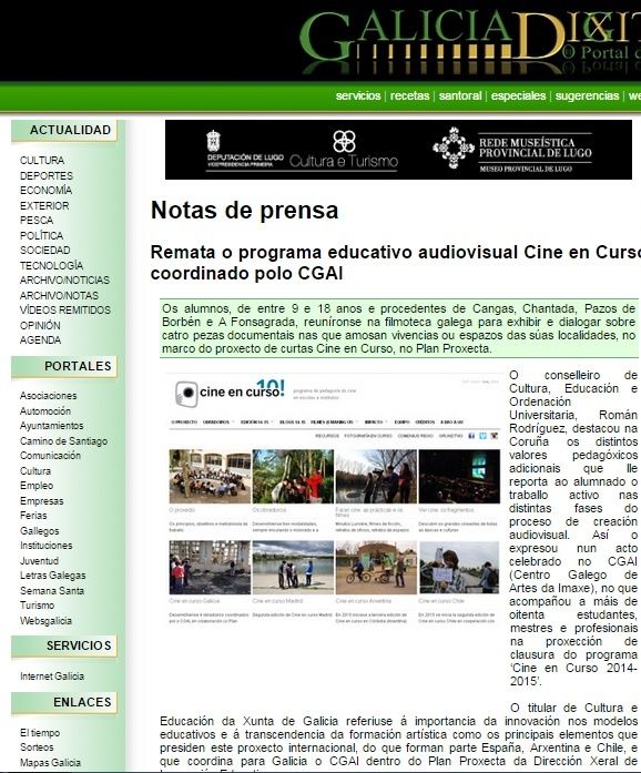 Presentació de les quatres pel·lícules realitzades a Cine en curso Galicia: Deixando atrás(CEIP A Rúa, Cangas), Mudando lares(CPI Curros Enríquez, Pazos de Borbén), O camiño do tempo (IES Plurilingüe Fontem Albei, A Fonsagrada), Flúe o Miño entre socalcos(IES Val do Asma, Chantada).
