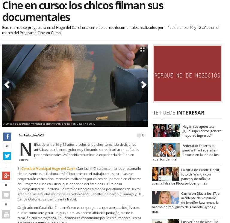 Projecció dels films realitzats pels dos centres participants a Cine en curso Córdoba 2014. Es projecten: El Buscavidas, Transformando maderas, Manos de Arcilla, Hombre de Hierro, 60 segundos de pintura, Burbusoda, Quemando Gomas, Hilando Sueños dels alumnes de la Escuela Gobernador Ceballos i La Panadería Santa Rita, Rodados Kike, Peluquería Lourdes, La hora de comer, La peluquería, La construcción, El taller de Sebastián, La carpintería de Daniel dels alumnes de la Escuela Dr. Carlos Ordoñez.