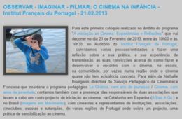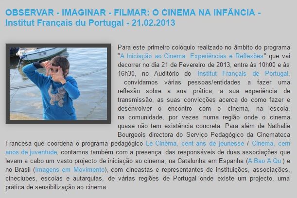 En el marc de les jornades “ A Iniciação ao Cinema: Experiências e Reflexões" celebrades a Lisboa del 18 al 23 de febrer; presentació dels films realitzats a ‘Cinema, 100 anos de Juventude’ per l’Associació Os Filhos de Lumière el curs 2011-2012.