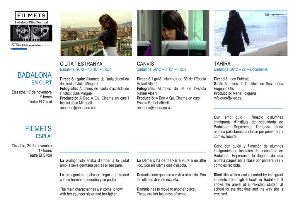 Projecció del film Canvis, realitzat pels alumnes de l’Escola Rafael Alberti i Ciutat estranya realitzat pels alumnes l’Institut Júlia Minguell a Cinema en curs 2011-2012 al Festival FILMETS en el marc del cicle ‘Badalona en curt’.