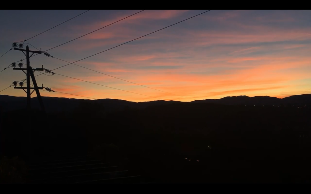 Sigue una composición donde la línea de horizonte está en medio de la imagen, pero, esta misma, me da la sensación que tiene un peso visual más marcado en el lado izquierdo, que es donde se halla una torre de alta tensión. puede que, del mismo modo, el peso se estabiliza gracias a que en el lado opuesto de la torre se encuentran los colores más claros y cálidos, los amarillos y blancos, lo que hace que el peso se reparta más o menos uniformemente en todo el video.