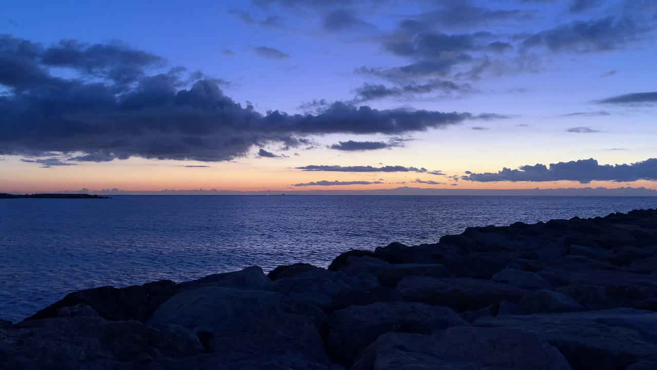 Els colors blaus del pla em donen tranquilitat i certa somnolencia que es per mi el que transmet principalment el color blau. Però a la vegada encara estan aquells tons vermellosos i groguencs més destacats que fan una mica de barreja en el pla, donant-li més força. I juntament amb l'absència de persones a la platja i amb les grans roques, es crea un plà que em transporta a un espai propi d’estiu que m’encanta, però que també compta amb uns colors i una força de l’hivern.