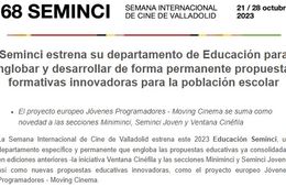 La Semana Internacional de Cine de Valladolid estrena este 2023 Educación Seminci, un departamento específico y permanente que engloba las propuestas educativas ya consolidadas en ediciones anteriores -la iniciativa Ventana Cinéfila y las secciones Miniminci y Seminci Joven-, así como nuevas propuestas educativas innovadoras, como el proyecto europeo Jóvenes Programadores - Moving Cinema.