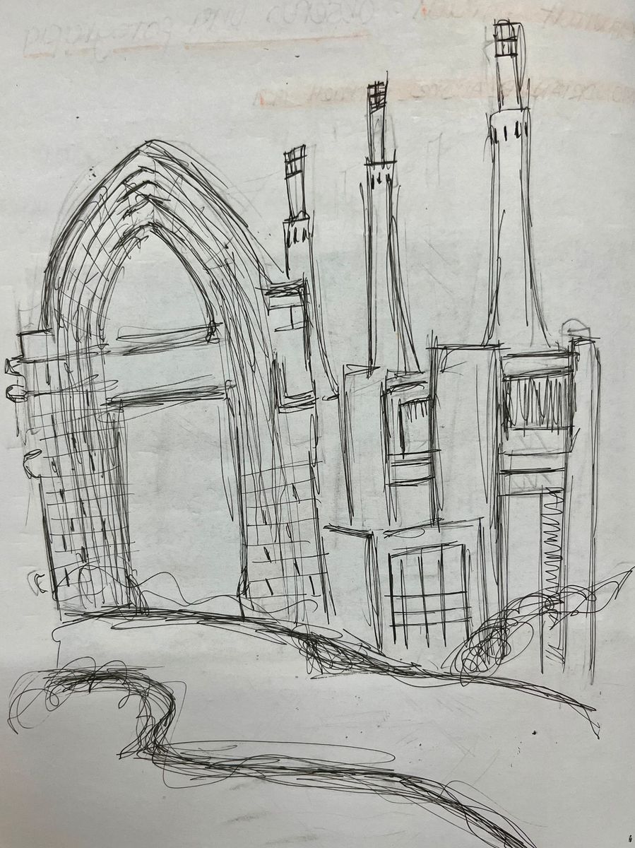 Comencem amb el dibuix de la Danielle, té un estil més realista. Podem observar l’arc amb una xemeneia que amaga les altres dues. Als costats hi ha dues palmeres molt altes i darrere de tot això està la platja amb uns ocells en el cel. A continuació, podem contemplar el del Manuel, que també conté el mateix arc, les tres xemeneies i el riu. Però, a diferència del primer, aquest no té colors però si vida en els moviments del bolígraf. També, està el de Marc que té una perspectiva diferent ja que les tres xemeneies surten d’un cercle que ho podem imaginar com un món o de la lent d’una càmera.